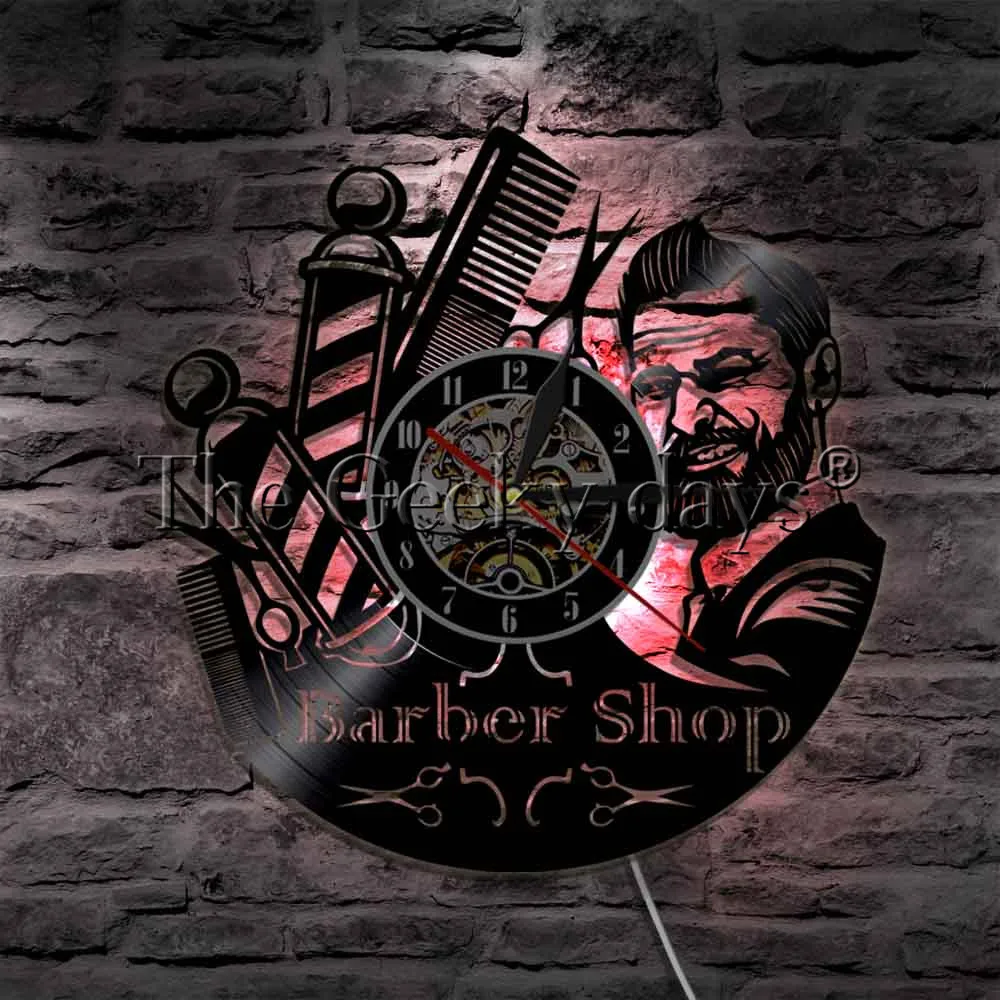 BEST 1Piece Barber Shop Sign Wall Watch LED Hanging Lamp Vinyl Record Wall Clock Hairdresser Salon Hair